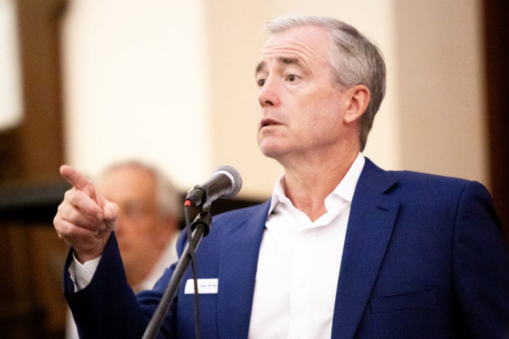 Keogh points to an audience member with a question during the forum. VON SMITH/STAFF PHOTOGRAPHER