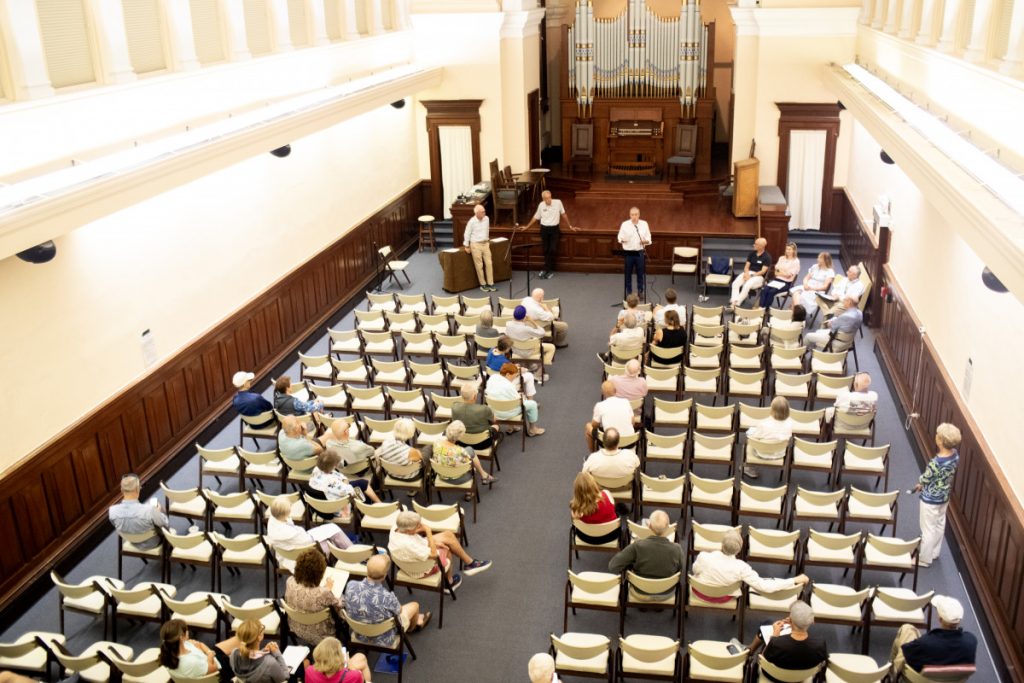 Interim Chief Executive Kyle Keogh answers questions and fields suggestions from a small audience Monday in the Hall of Christ, during a Forum Dialogues session dedicated to the Institution’s financial sustainability. VON SMITH/STAFF PHOTOGRAPHER
