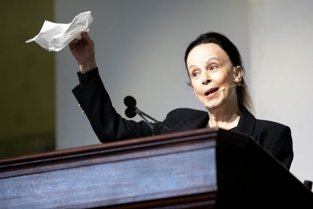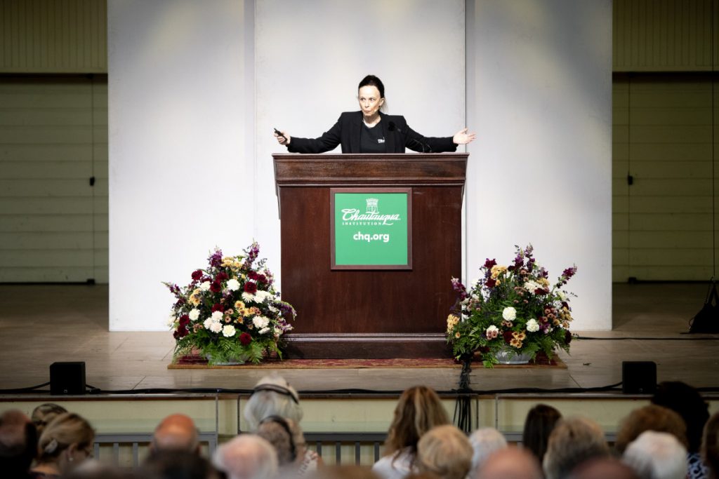 Contextualizing her experience, Wright presented photographs of herself — one was from Syria during the COVID-19 pandemic, which she described as a “particularly bad hair day.” One photograph was from the Iranian Revolution at the old Sheraton Hotel, of Wright standing alongside a female colleague, the wall behind them reading “Down with the USA.” Another depicted Wright bumping into Iran’s ambassador to the Vatican in the streets of Rome. Turning back to Chautauqua, Wright shared a memory of a more recent moment.