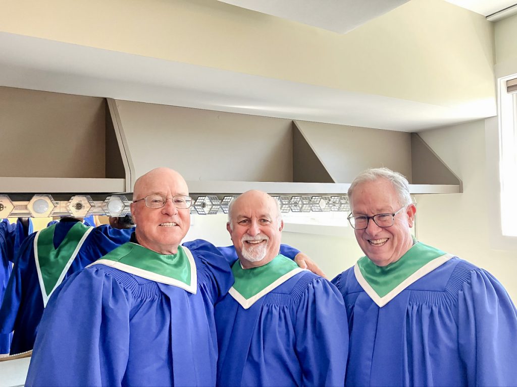 Rob and Dave started singing with the Motet in the late 1980s; Eric started around 1998. Eric has become involved in the Community Music Project in Jamestown, in both the CPM Chorale and the Chamber Choir, and he sings with the Community Choir in Fredonia. That choir is joining other choirs in London in June 2026.